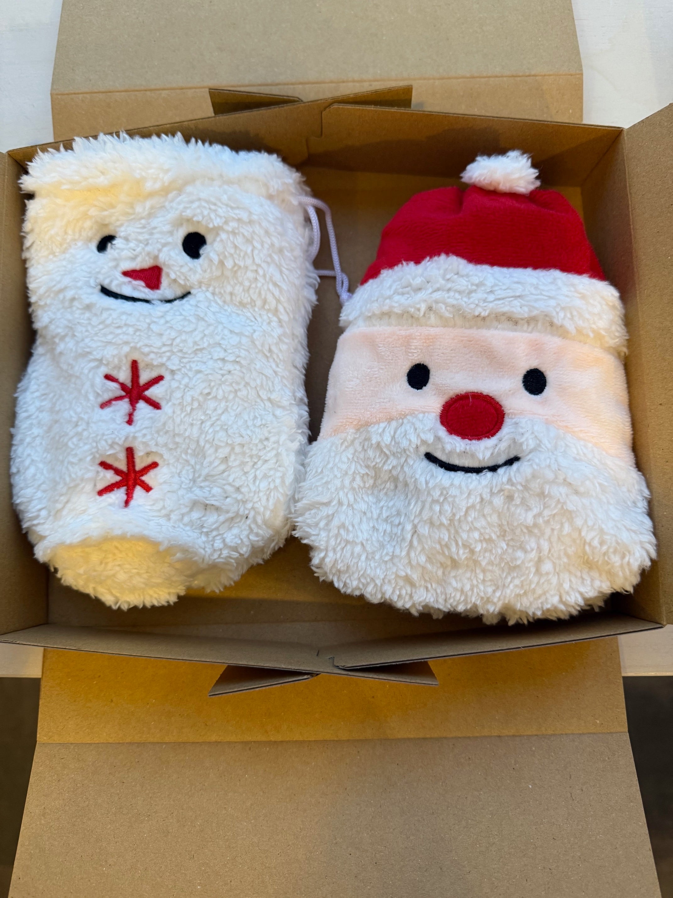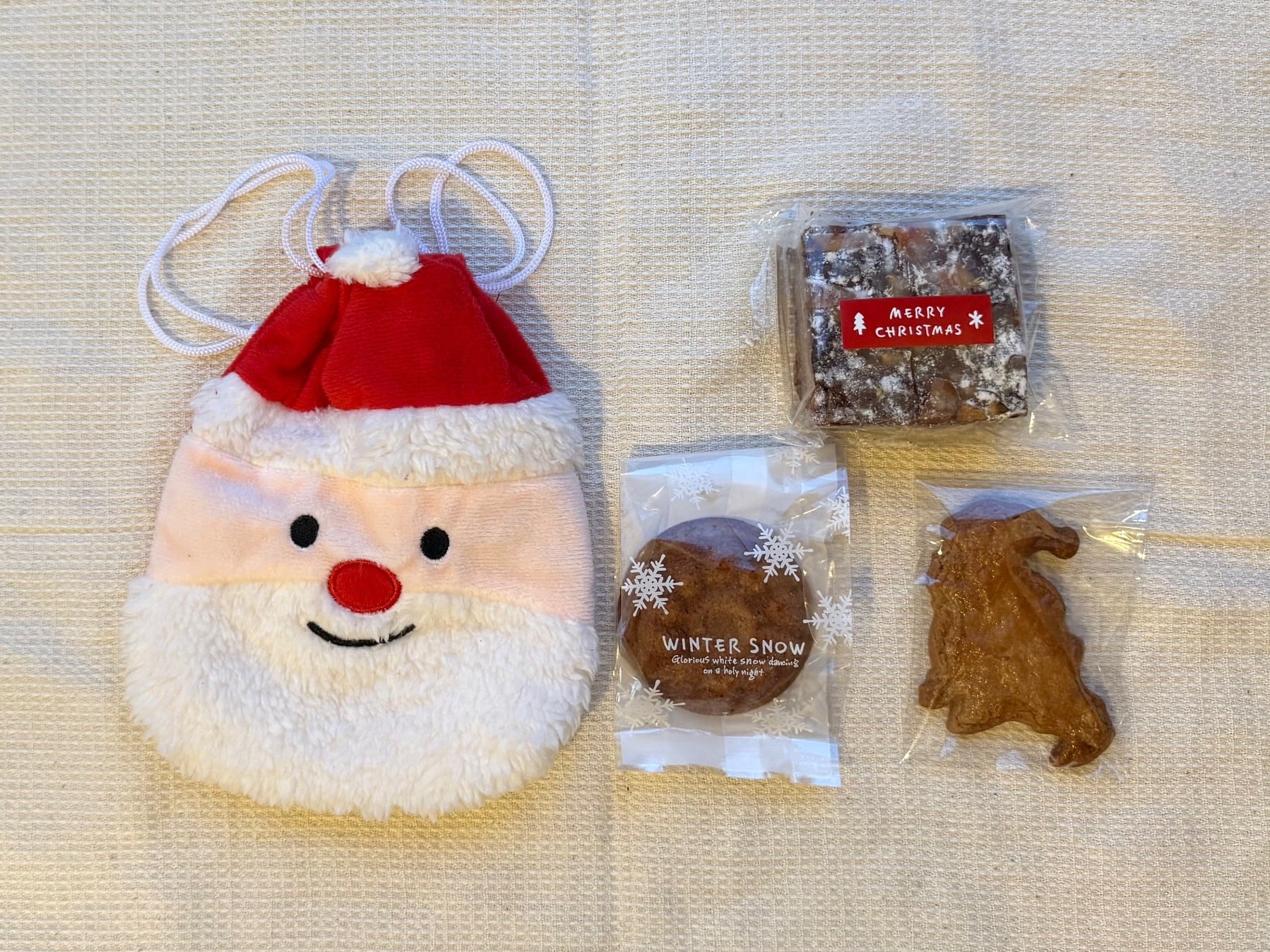 サンタと雪だるまのきんちゃく袋にお菓子を詰めたプチギフトです。